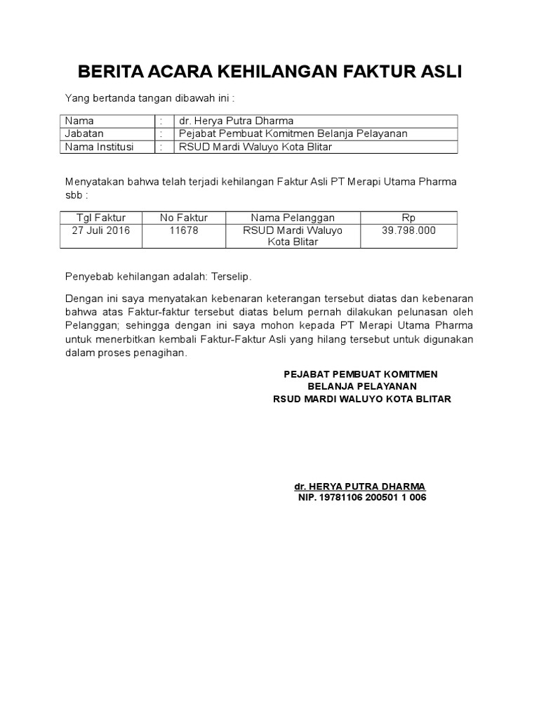 Feb 11, 2020 · contoh surat pernyataan kehilangan faktur tagihan surat 26 contoh berita acara untuk tagihan contoh fine contoh surat kehilangan faktur tagihan in addition, it will feature a picture of a kind that might be seen in the gallery of contoh surat kehilangan faktur tagihan. Faktur tersebut hilang oleh pihak kami, oleh karena itu kami mengeluarkan surat ini sebagai pengganti tagihan yang hilang tersebut di atas. May 23, 2015 · rp.12.026.552. Jun 02, 2021 · contoh surat pernyataan kehilangan untuk dokumen faktur. Contoh surat pembatalan faktur pajak surat pembatalan faktur pajak sampai sekarang masih digunakan meskipun kini sudah dipermudah dengan adanya e faktur. Berikut ini contoh format surat kehilangan yang dapat dipelajari: 30 contoh surat pernyataan kehilangan terbaru 2019. Contoh surat pernyataan kehilangan stnk doc. Akuntansi puna na mevi laporan penerimaan barang format 1236 x 1600 blognya yeppo format 499 x 314 pixel download surat pengesahan penerimaan cek format 730 x 1033 pixel download contoh surat akuan penerimaan bayaran format 768 x 1024 pixel download contoh surat block style. Contoh surat keterangan kehilangan buku tabungan dari sekolah. Pada bagian di atas, anda sudah mengetahui mengenai bagian bagian penting yang harus ada dalam contoh surat pernyataan kehilangan dokumen faktur. Jakarta, 11 januari 2018 kepada yth, toko sportskita jakarta barat. Dengan demikian kami menyatakan bahwa jika dikemudian hari di temukan kembali,maka tagihan tersebut sudah tidak berlaku sebagai bukti tagihan lagi.